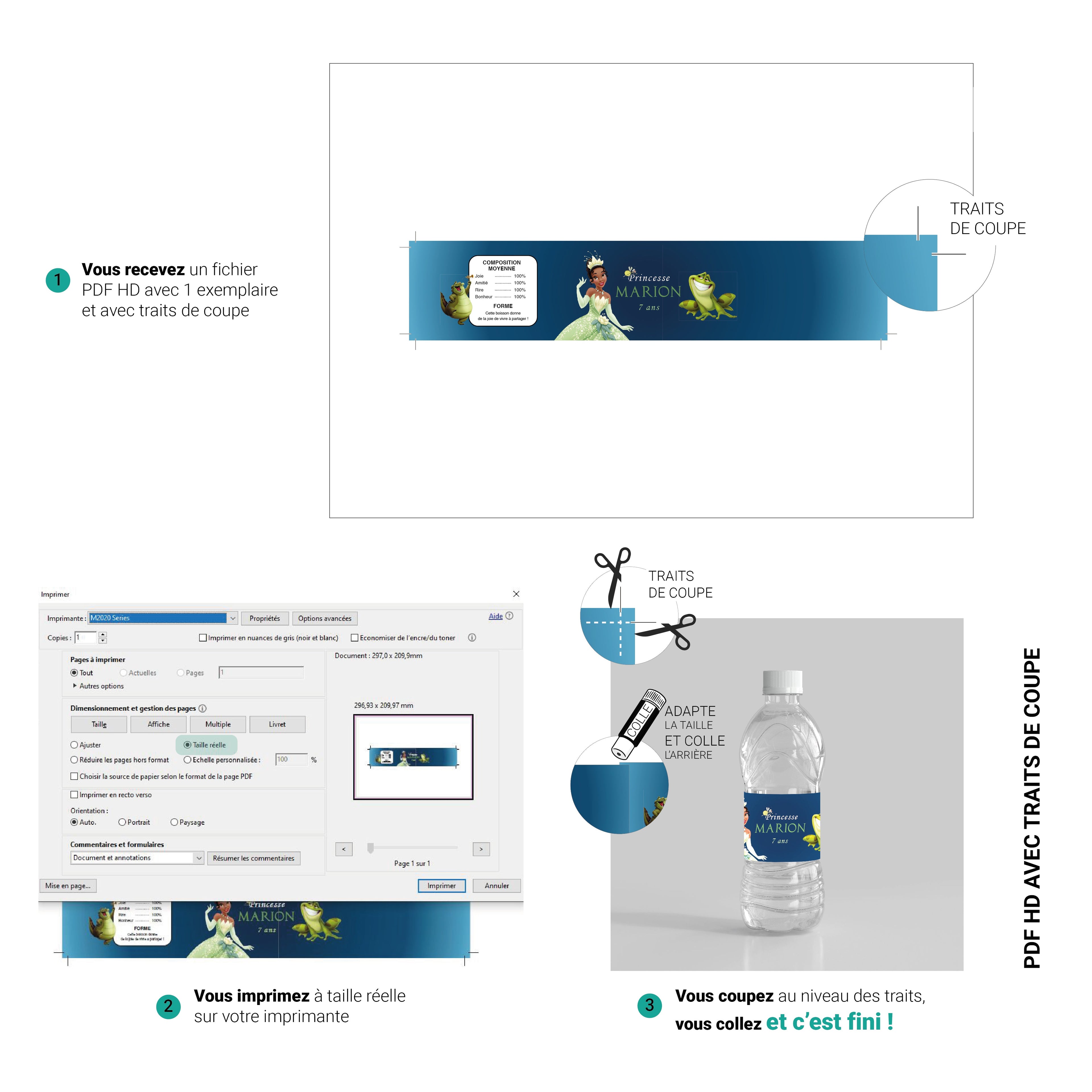 • Attention la photo n'est pas contractuelle ! L'étiquette est adaptée à chaque prénom, âge et phrase. Vous devez ensuite la couper pour l'adapter à la taille de votre bouteille (ici, 50cL).