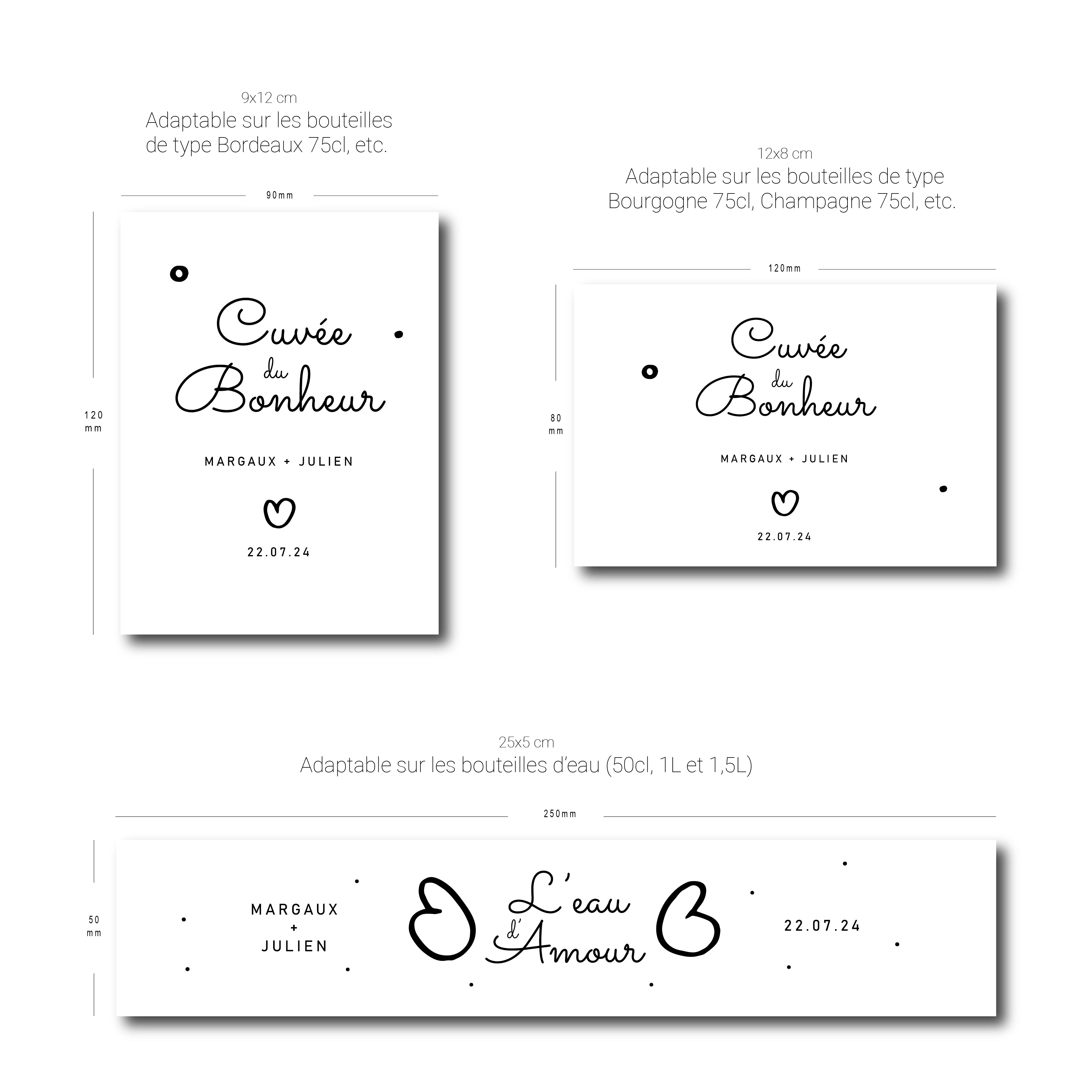 • Attention la photo n'est pas contractuelle ! Les étiquettes sont adaptées à chaque prénoms et date. Vous devez ensuite les découper pour les adapter à la taille de vos différentes bouteilles.