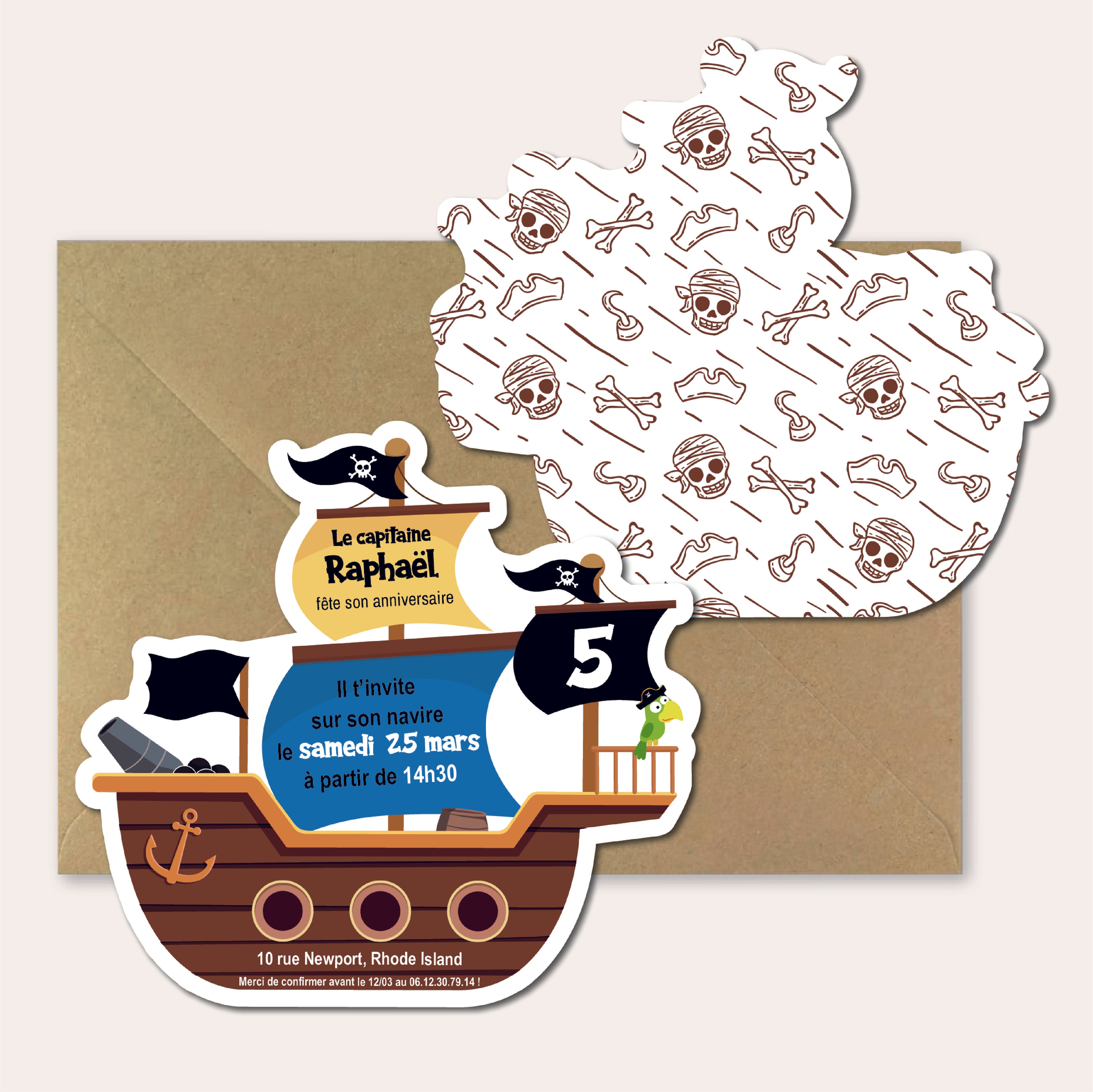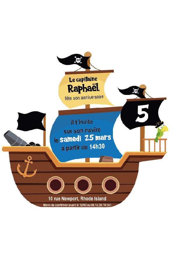 Voici une carte d'invitation recto-verso en forme de Bateau Pirate à personnaliser et à imprimer tant que vous le voulez (ou à envoyer au format numérique), pour une fête sur le thème des Pirates !