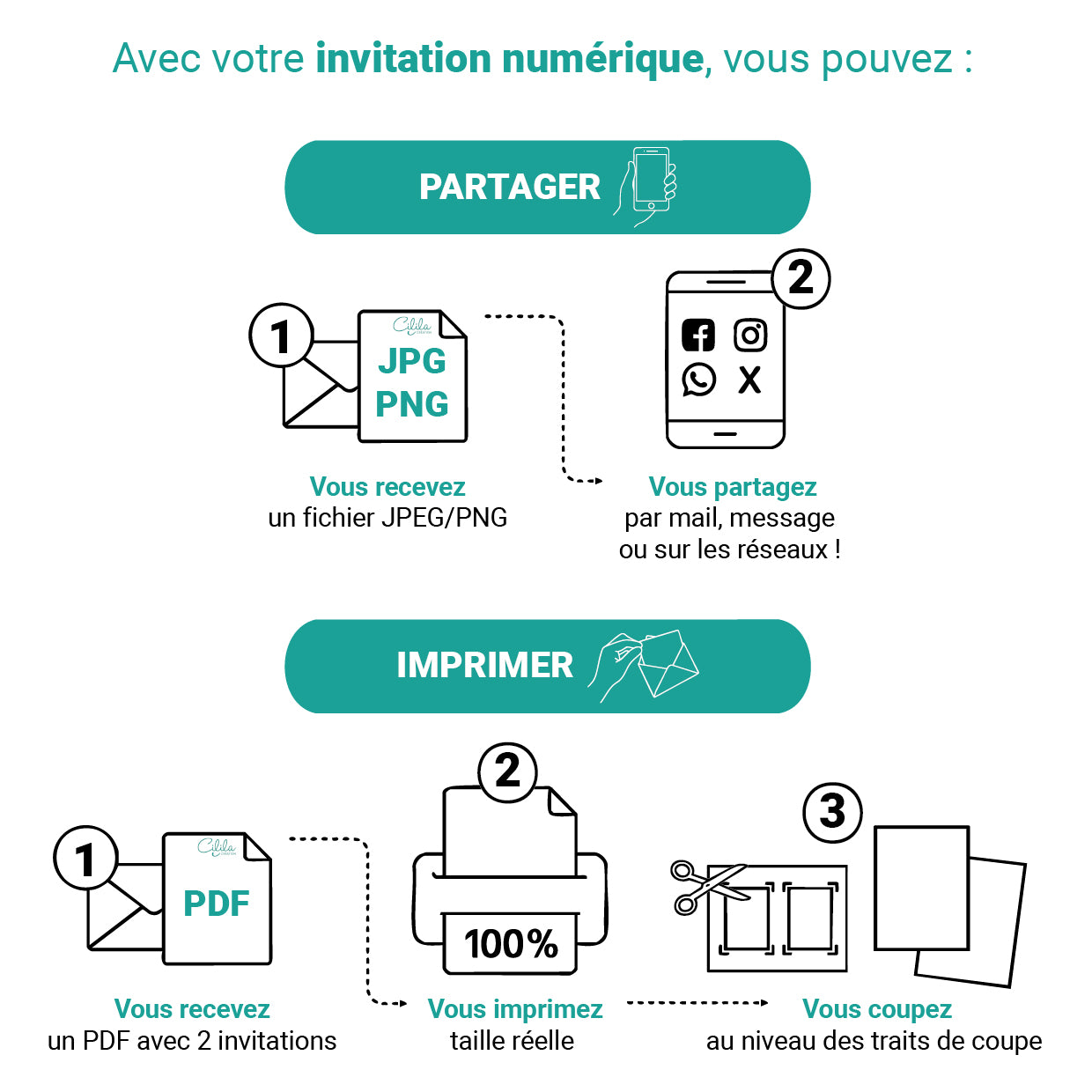 - Pack numérique reçu : un PDF A4 avec 2 invitations ~10×15 cm (prêt à imprimer), un JPEG (pour partager en ligne), un PNG si besoin (fond transparent pour certains designs), des repères de coupe quand nécessaire, un petit guide pas-à-pas d’impression & coupe, et votre facture par e-mail.