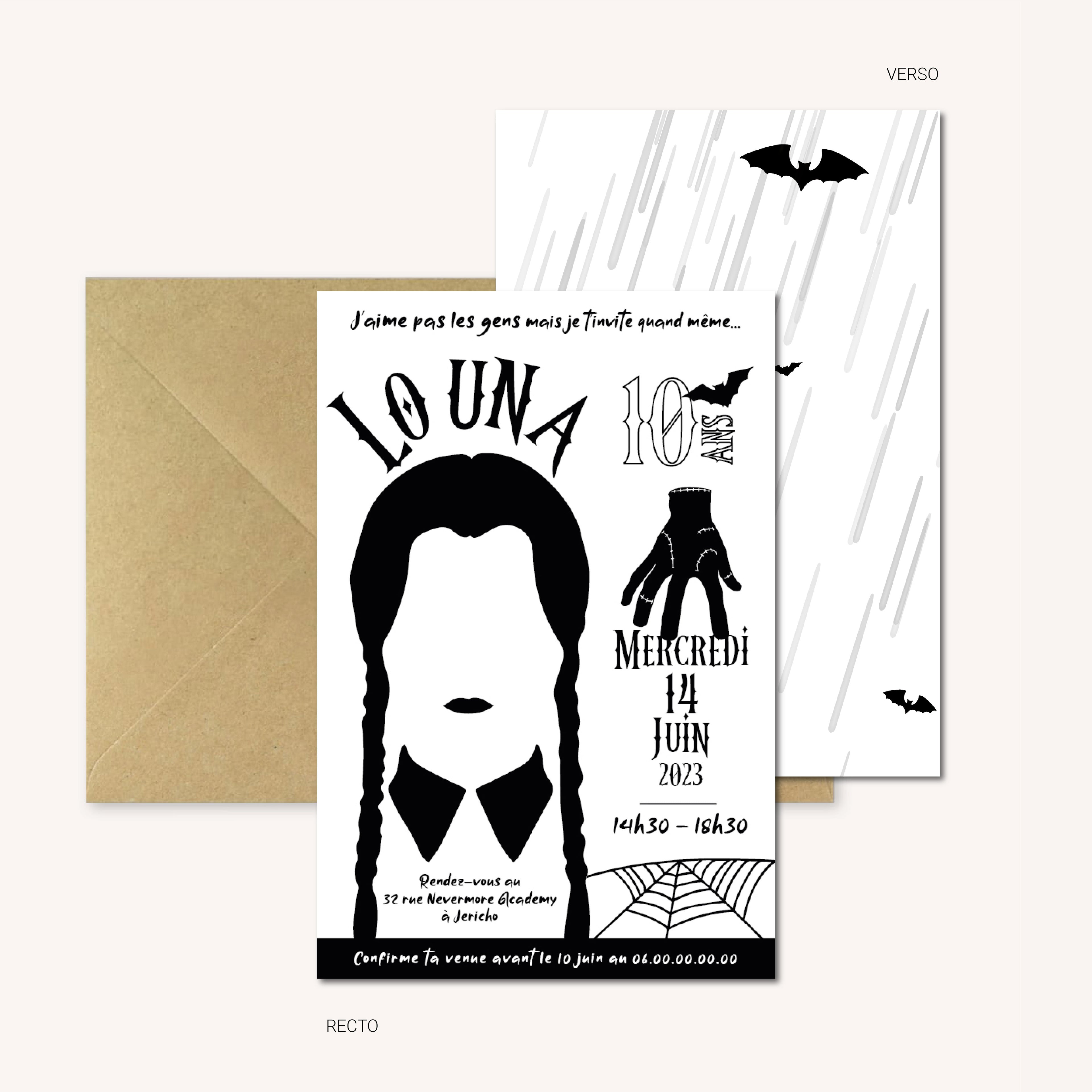 Voici une carte d'invitation recto-verso à personnaliser et à imprimer tant que vous le voulez (ou à envoyer au format numérique), pour une fête sur le thème de Mercredi Addams !