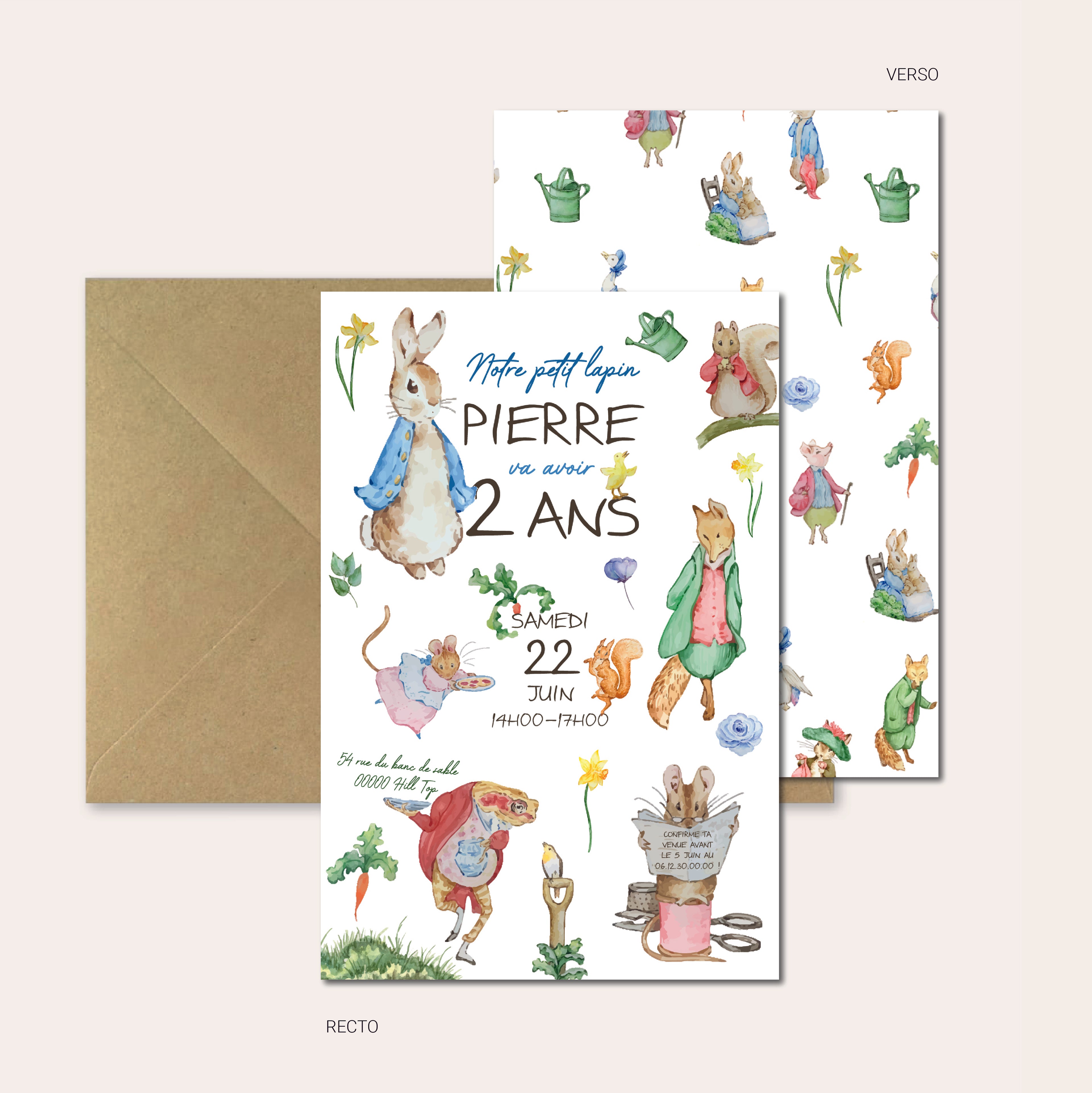 Faites la fête avec Pierre Lapin et amis ! Personnalisez et imprimez à volonté (ou envoyez numériquement) cette invitation recto-verso. Pour un anniversaire inoubliable et plein de folie avec le jeune lapin malicieux et ses amis. Hop, hop, hop, c'est parti!