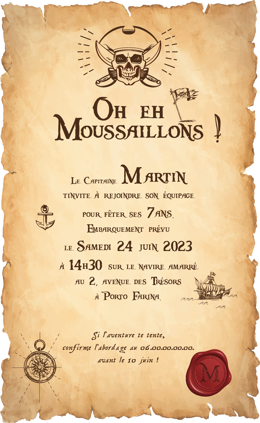 Personnalisée avec vos infos, l’invitation est illustrée façon vieux parchemin pour un rendu réaliste et original. Le sceau de cire s’adapte à l’initiale de votre enfant pour une finition digne d’un vrai capitaine.