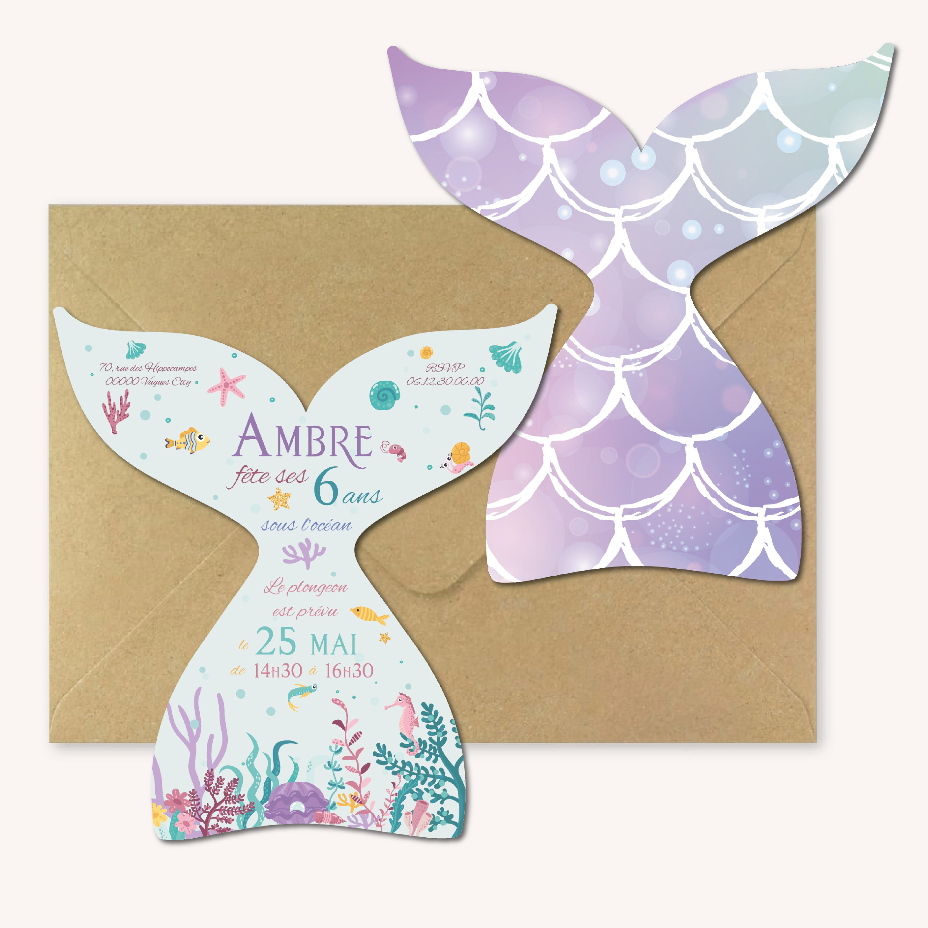 Voici une carte d'invitation recto-verso en forme de Queue de Sirène à personnaliser et à imprimer tant que vous le voulez (ou à envoyer au format numérique), pour une fête sur le thème des Sirènes !