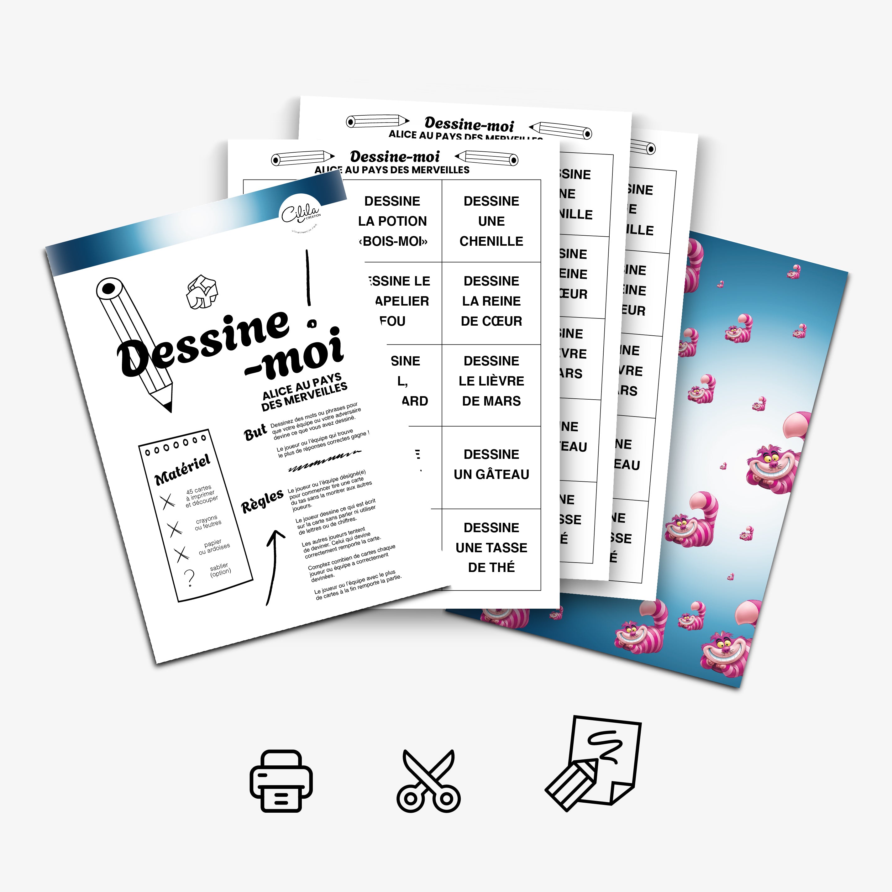 Animez l'anniversaire de vos enfants avec le jeu "Dessine-moi" sur le thème d'Alice au pays des merveilles ! Facile, rapide et amusant, ce jeu de devinettes à dessiner est l'activité parfaite pour occuper les enfants lors d’une fête d'anniversaire.
