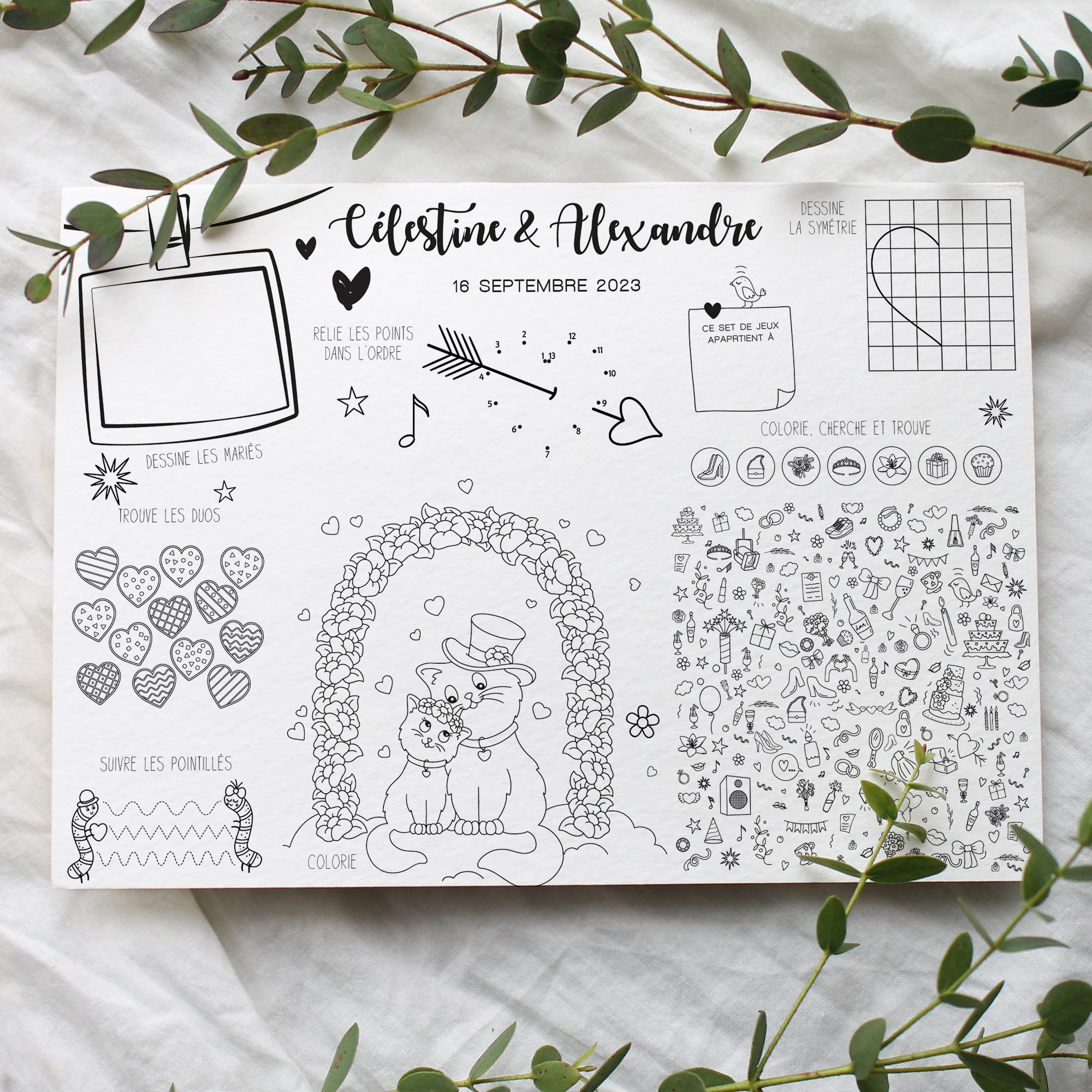 Les repas de Mariage peuvent s’avérer être longs pour les enfants, c’est pourquoi ce set de table à personnaliser et à imprimer sera votre meilleur allié pour votre évènement. Composé de plusieurs activités, il servira à faire patienter calmement les enfants entre chaque plat.